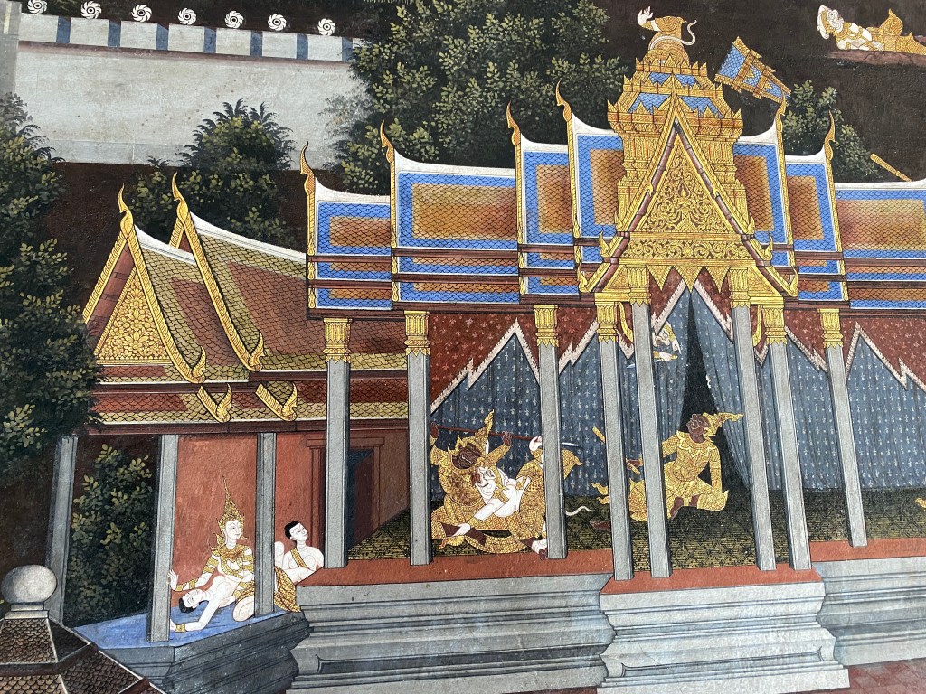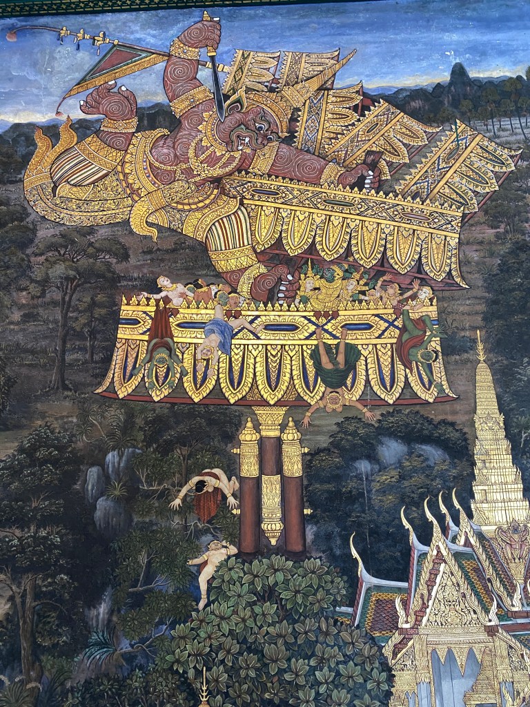 La fresque, à l’intérieur, le long du mur d’enceinte, sorte de tapisserie de Bayeux, raconte la légende de l’origine du royaume Ramayana. On y croise des géants, des singes, des dieux, de simples mortels et même des sirènes… j’avoue que je n’ai pas tout compris à part qu’il y a eu des enlèvements, des prisonniers, des esclaves, des incendies, des guerres, bref, rien que du classique dans la construction d’un royaume 😅, je prendrai le temps de lire l’histoire un de ces jours et peut-être que vous aussi si vous êtes curieux. Vous pouvez cliquer sur chaque image pour mieux la voir et zoomer dessus éventuellement 😉.